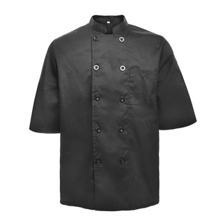 Our classic chef coats are constructed with 65/35 poly/cotton fabric. This is a short-sleeve, double-breasted chef coat with matching buttons.